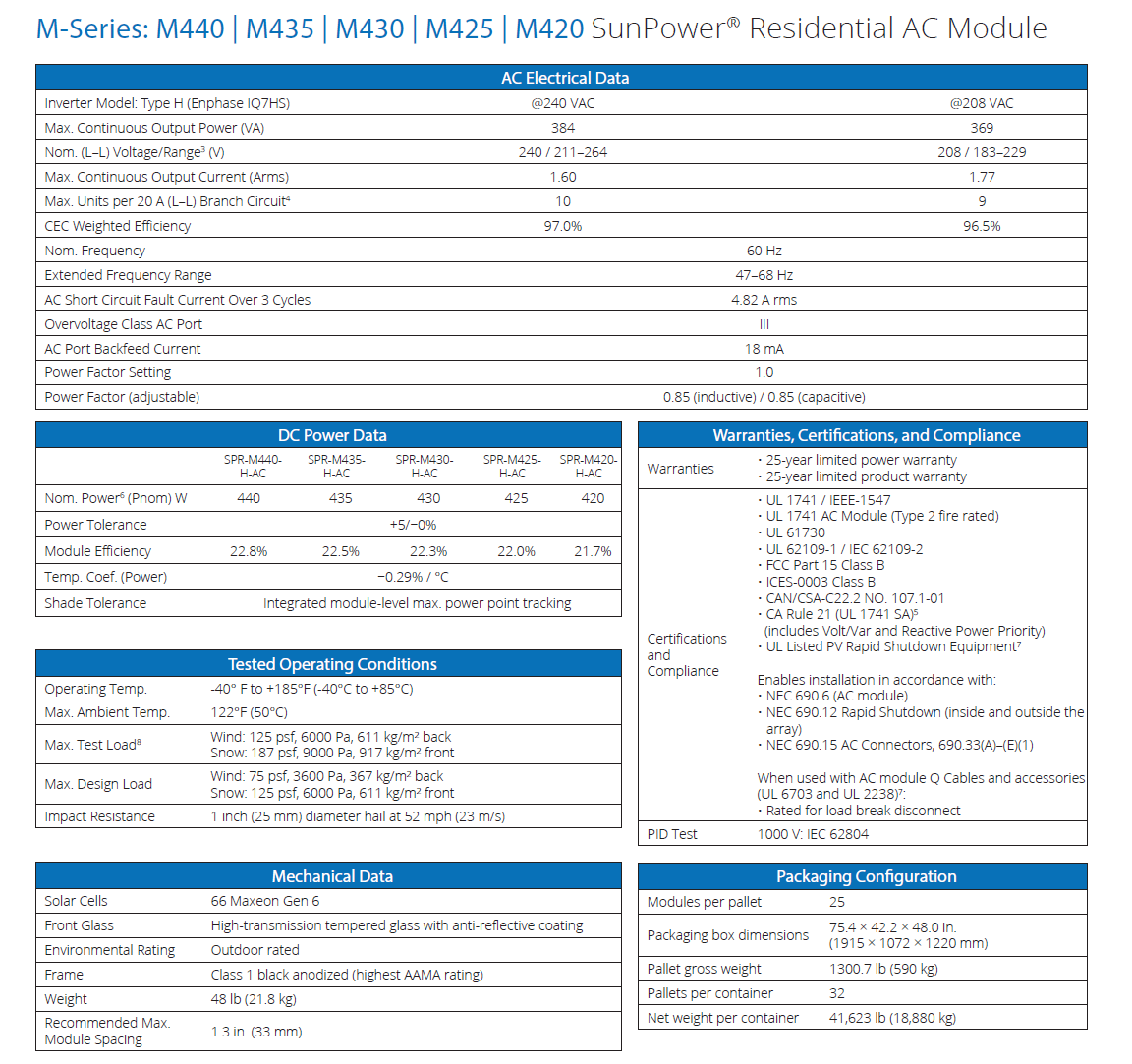 Maxeon-SunPower, AC Module, M440 with Enphase IQ7HS Micro Inverter, 440W DC, 384W 240V/60Hz AC, 40mm Black Frame with White Back-Sheet, BOW, 415.6 PTC, SPR-M440-H-AC.